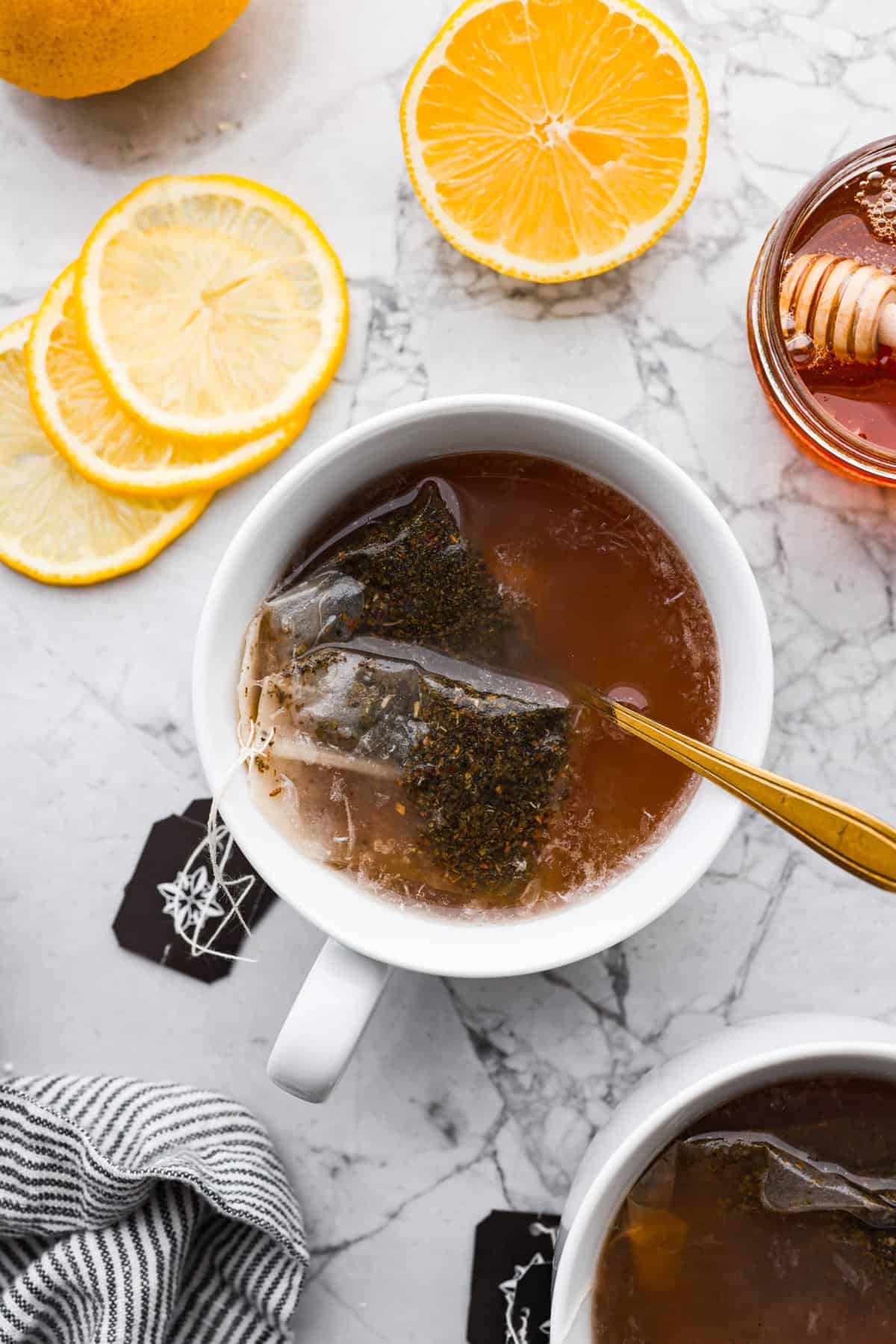 - Steep the Tea Bags: Add the tea bags and steep according to the directions on the tea boxes or until the tea is as strong as you prefer. I steeped mine for about 4 minutes. Add fresh lemon slices, if desired.